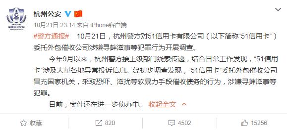 21日晚间,杭州公安局官方微博发布警方通报。通报称,10月21日,杭州警方对51信用卡委托外包催收公司涉嫌寻衅滋事等犯罪行为开展调查。今年9月以来,杭州警方接上级部门线索传递,结合日常工作发现,51信用卡涉及大量各地异常投诉信息。经初步调查发现,51信用卡委托外包催收公司冒充国家机关,采取恐吓、滋扰等软暴力手段催收债务的行为,涉嫌寻衅滋事等犯罪。目前,案件还在进一步侦办中。