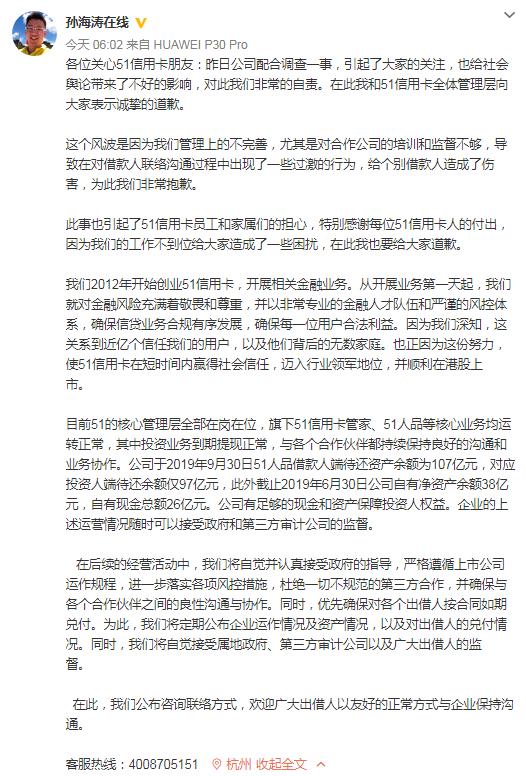此外,51信用卡创始人孙海涛早间在其个人微博发文致歉。他写道,昨日(21日)公司配合调查一事,引起大家的关注,也给社会舆论带来不好的影响,对此公司非常自责,在此和51信用卡全体管理层向大家表示诚挚的道歉。