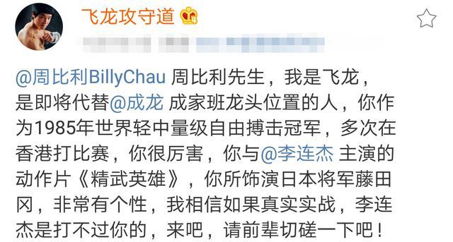 随即,飞龙对李连杰、邹市明、甄子丹、吴京等人予以不留情面的抨击:“李连杰、甄子丹、吴京、托尼贾、向佐、刘承羽、邹市明,所有马云《功守道》的手下败将们,你们好,谢谢你们在2019年默默的接受我的挑战,你们不回复就是默认,不打就是怕输,这没有关系,既然你们都是马云的手下败将,那么我就继续挑战马云,我打!”